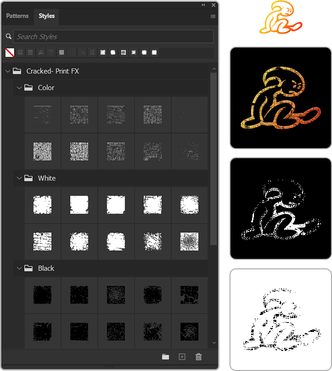 パック内の様々なスタイルで、たった一つのデザインがどのように変化するかをご覧ください。カラー、黒、白のどの要素を使っていても、Cracked-Print FXはあなたのニーズに合わせて変化します。作品の核となる部分はそのままに、質感、深み、そして個性を加えます。