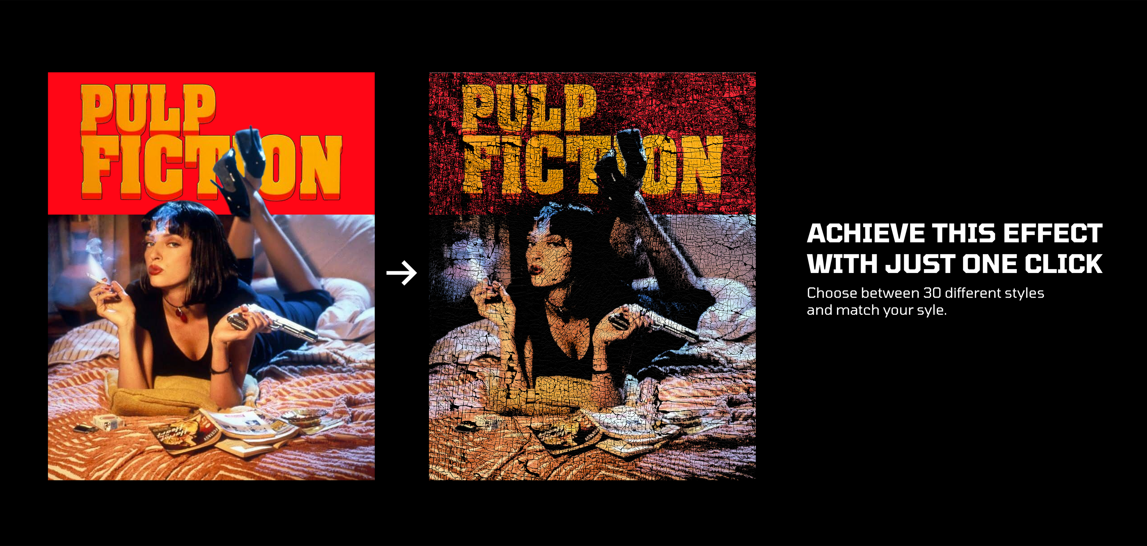 See how a single design transforms across different styles in the pack. Whether you're working with color, black, or white elements, Cracked-Print FX adapts to your needs — keeping the core of your work intact while adding texture, depth, and attitude.